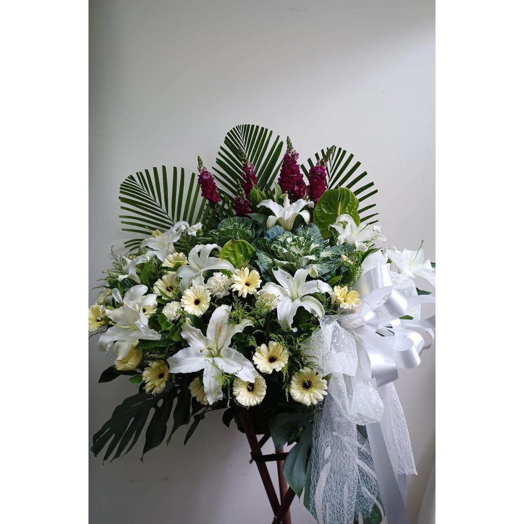 貨品名稱:帛事花籃-FB083 花  材:葉牡丹、百合、太陽菊及康乃馨 備  註: 1. 除上述地區外,運費需另外報價,請致電 2327-7116 與負責同事聯絡。